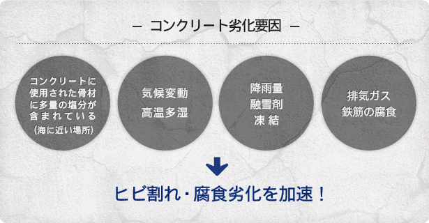 コンクリート構造物は、「安価」「メンテナンスフリー」「高耐久性」のうたい文句で大量に建造されてきました。